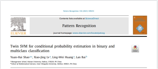 海南大学文化旅游协同创新中心邵元海教授团队在《Pattern Recognition》(IF=8.518,SCI一区权威期刊)上发表了题为“Twin SVM for conditional probability estimation in binary and multiclass classification”(两分类和多分类的条件概率估计双子支持向量机)的研究成果。《Pattern Recognition》被认为是国际模式识别领域的顶级期刊之一,中国科学院分区计算机科学一区Top。